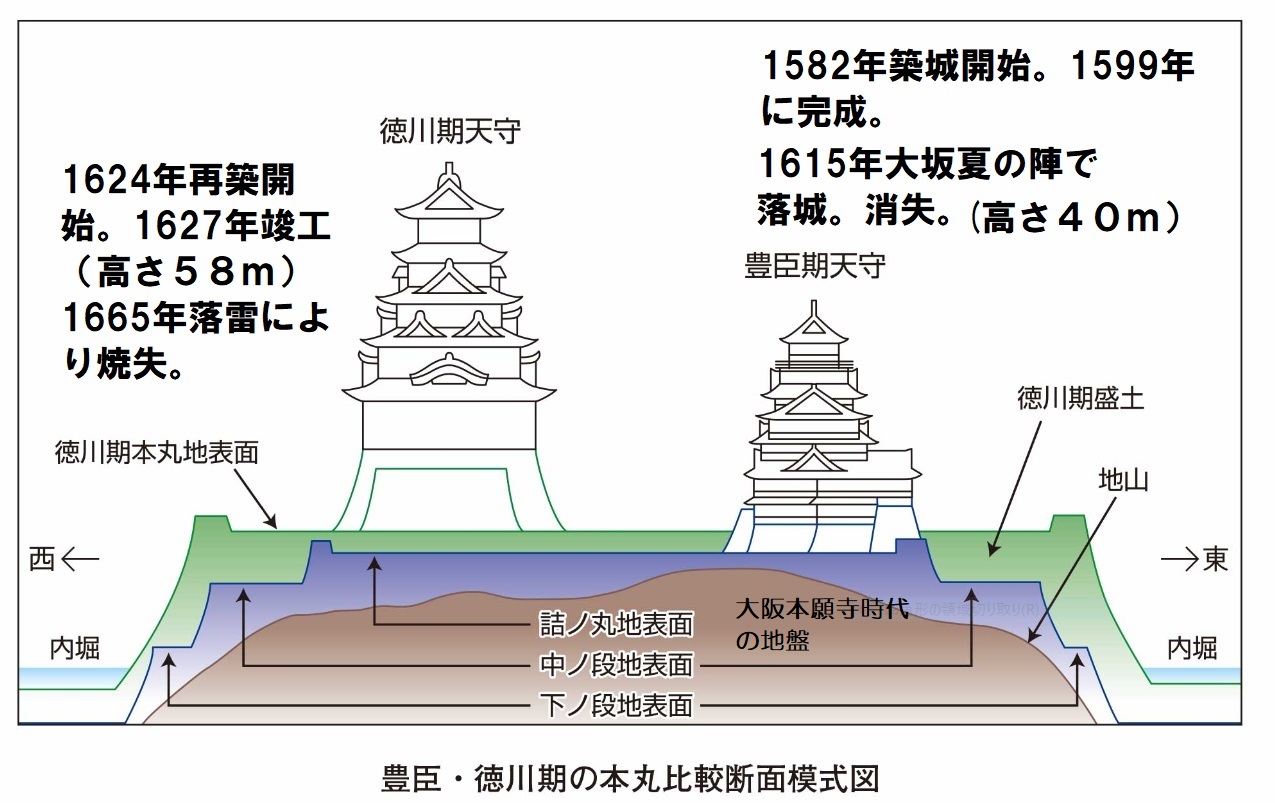 大阪城の断面(本願寺の上に城が造られた)