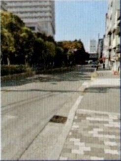 街道筋を歩くと、埋め立てられた鯰江川跡の道路が堤防上の街道より階段状に低くなっていることがわかります。