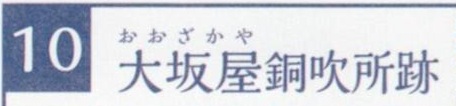 このあたりは炭屋町と呼ばれ、大坂屋銅吹所がありました。江戸時代初期に日本は世界有数の銅産国になり、主要な輸出品でした。銅の生産と流通を独占したのが長堀川沿いの大坂の銅吹商で、生産量は鰻谷(うなぎだに)の住友銅吹所が1位、炭屋町の大坂屋銅吹所が2位で、大坂屋は秋田の阿仁銅山からここまで銅鉱を運びました。